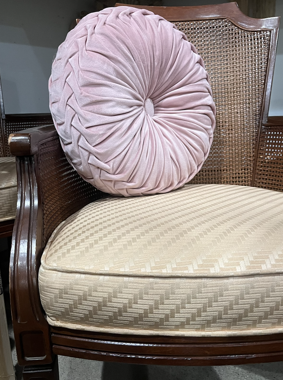 Cherry framed caned-back armchairs with cream fabric upholstered seats